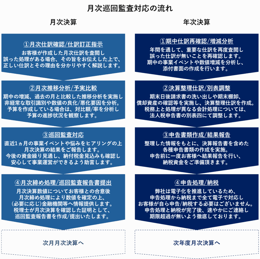 月次ベースで会計処理や税務面のチェックを実施し、毎月お客様のもとへ訪問の上